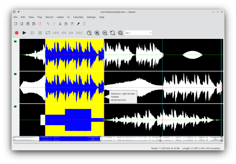 WAV (.wav) Ogg/Opus (.opus) Ogg/Vorbis (.ogg) MP3 (.mp3) FLAC (.flac) ASCII coded audio (.ascii) all file formats supported by libaudiofile (some formats are import only)